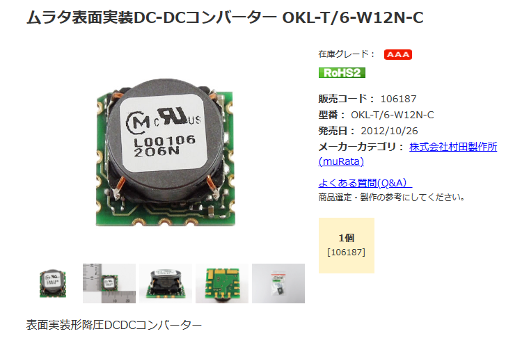 DCDCコンバーターはLED基板などの別回路に電源を渡すことも考えて余裕のある設計にしたかったので秋月で売っている村田製作所のOKL-T/6-W12N-Cを使いました。